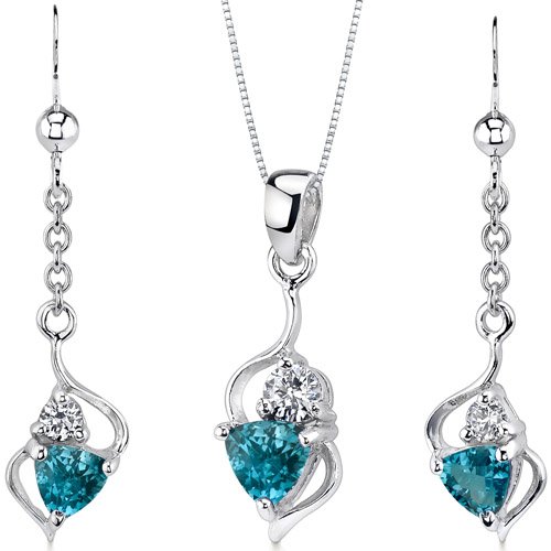 Gemstones: Genuine London Blue Topaz, Trillion Cut, 1.75 carats total gem weight. Blue Topaz have a dark Midnight Blue Hue, Brilliant Sparkle and Clean Clarity. Pendants and Earrings are made from Sterling Silver with a total metal weight of 4.10 grams. The set has a CZ accent and feature top quality craftsmanship with Rhodium finishing. Set includes a 18 inch / 46 cm Sterling Silver Box Chain and Designer Gift Box. Perfect gift for Christmas, Mothers Day, Valentines Day, Birthday, Graduation, Bridesmaids Jewelry. Style PER-SS3174