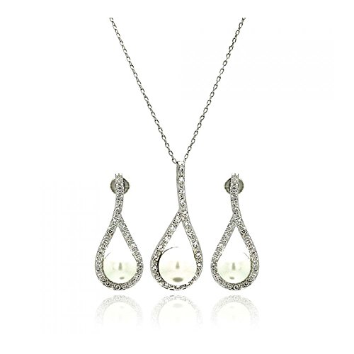 If you want to buy Rhodium Plated Brass Pearl Teardrop Clear Cubic Zirconia Hanging Stud Earring & Necklace Set safely and comfortably please click on the button below: